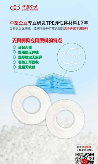 要想保障口罩的供應量,少不了各種原材料,尤其是口罩鼻梁專用料,它環保無毒、醫用級無異味、塑形穩定無反彈、易加工可回收、全塑無鐵絲。作為TPE行業的佼佼者,17年來,中塑企業始終專注于研發TPE彈性體材料,逐步成長為國際化的大企業。